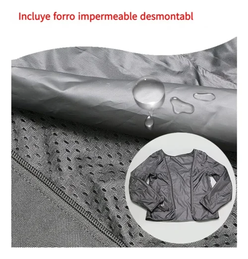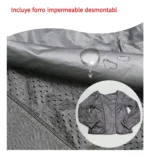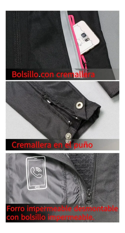 Su forro impermeable desmontable añade versatilidad, permitiendo usar la chaqueta incluso en días con lluvia ligera. Los detalles reflectantes en la parte delantera y trasera incrementan la visibilidad, aumentando la seguridad durante la conducción nocturna o en condiciones de poca luz.