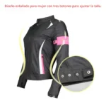 El diseño ajustable mediante cremalleras, botones y velcro permite que cada usuaria adapte la chaqueta a su figura, asegurando un calce perfecto sin comprometer la movilidad. La tela Oxford y malla de poliéster aportan resistencia y durabilidad, protegiendo frente al viento y el roce del asfalto mientras mantiene un tacto agradable.