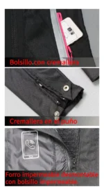El diseño transpirable con forro de malla evita la acumulación de calor y sudor, mientras que el forro impermeable desmontable ofrece protección frente a lluvia ligera. El ajuste mediante velcro, cremalleras y botones permite moldear la chaqueta a tu figura sin comprometer la libertad de movimiento.