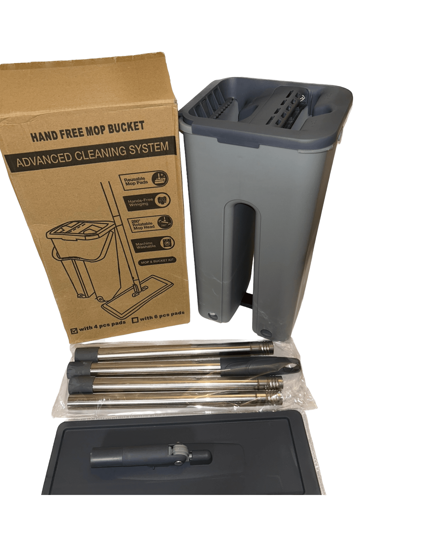 Este juego fregona cubo profesional es la solución ideal para quienes buscan una limpieza profesional y práctica en el hogar o negocio. Equipado con una mopa plana de microfibra lavable, un cubo compacto con escurridor manos libres y una varilla de acero inoxidable ajustable, garantiza resultados impecables en todo tipo de superficies como madera, cerámica, mármol, y más.